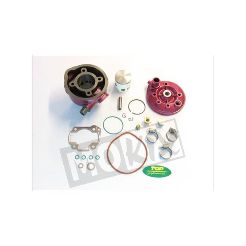 De bekende "roze top" 70 cc gietijzeren cilinderkit van Top Performances voor watergekoelde Minarelli horizontale blokken. Compleet geleverd.