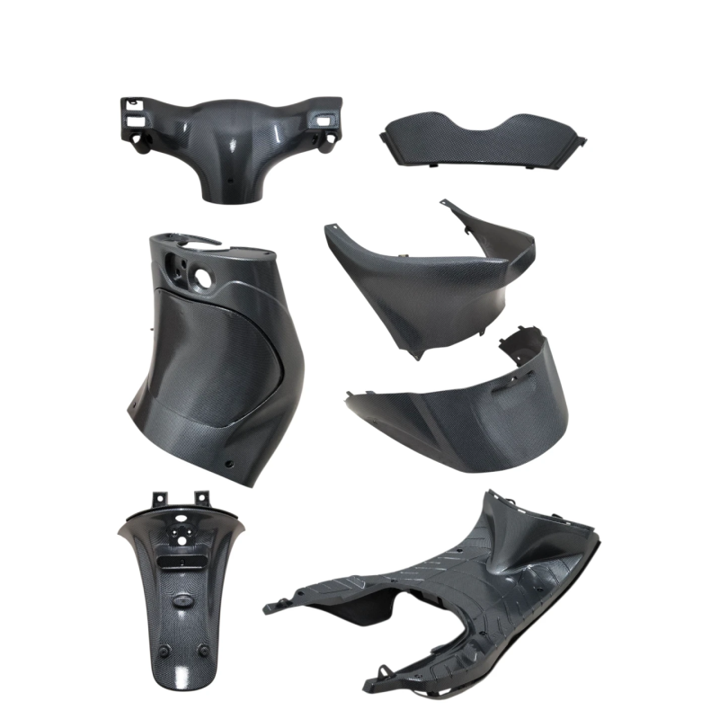 Complete 9-piece carbon look inner panel set for Piaggio Zip 2000. Includes handlebar cover, leg shield, floorboard, engine cover, and more. Ideal for styling or replacement.
