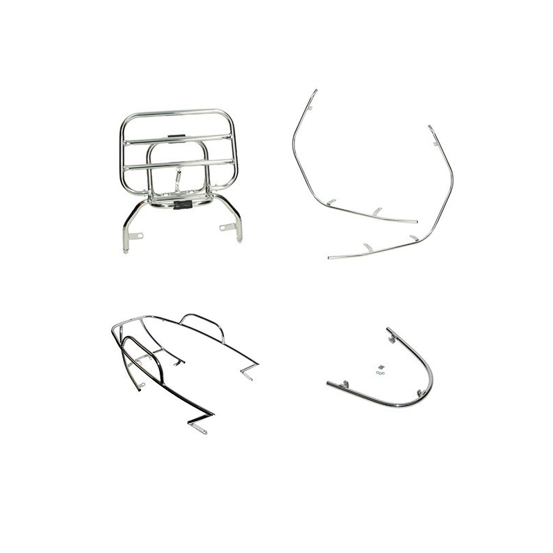 Chrome crash bar set for all Vespa LX-lookalike models like AGM VX50, VX50S, Riva and Riva Sport. Includes 4 pieces and a foldable rear rack.