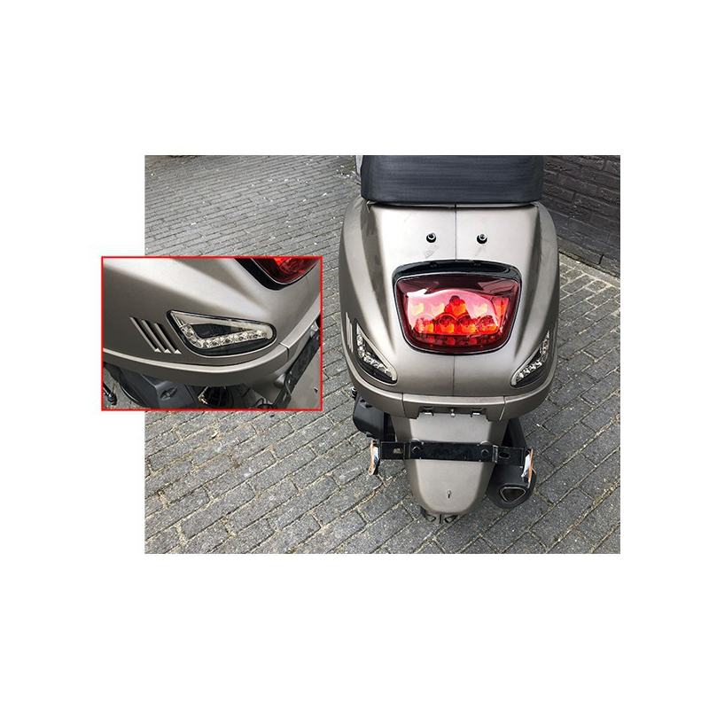 Complete your scooter’s rear lighting with this DMP LED indicator set featuring smoked lenses and Audi-style dynamic matrix lighting. The set includes integrated daytime running lights, brake light and tail light. E-mark certified and designed for easy installation with color-coded wiring.
