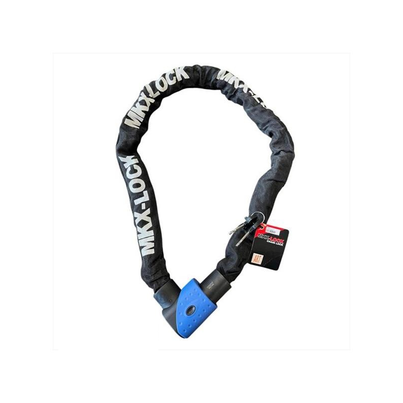 Durable MKX-Lock chain lock with 10 mm steel links and fixed head. ART 3* approved (ART.4114), 120 cm long, and easy to use. Includes 2 keys.
