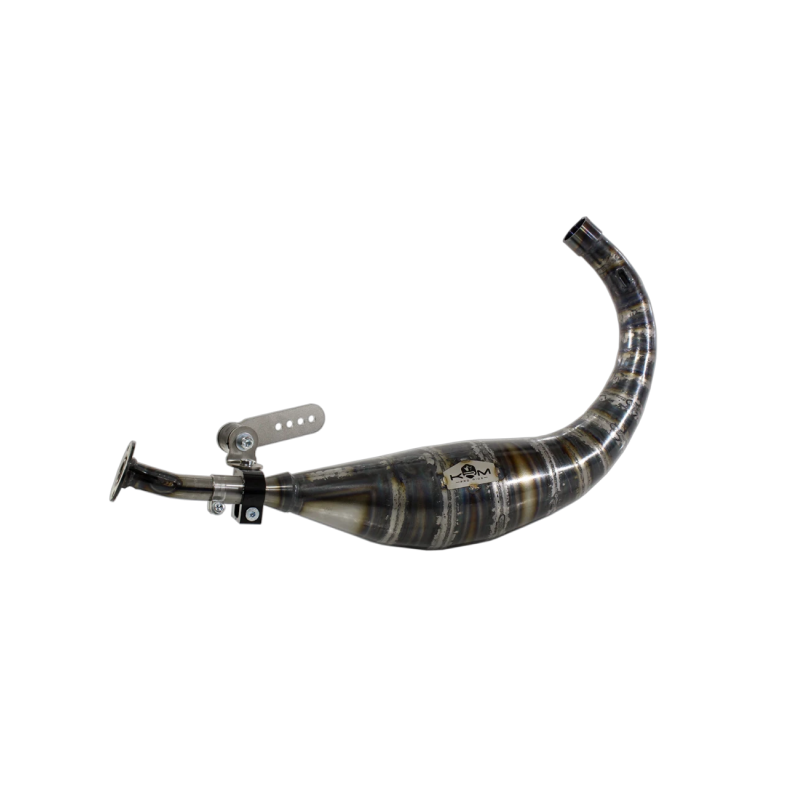 The KRM 70–80cc Low-Mounted Exhaust is designed for AM6 engines with high-performance 70–80cc setups. Made from 15 segments of 0.8 mm steel, hand-rolled and TIG welded, this exhaust delivers top-end power for serious racing and circuit use.