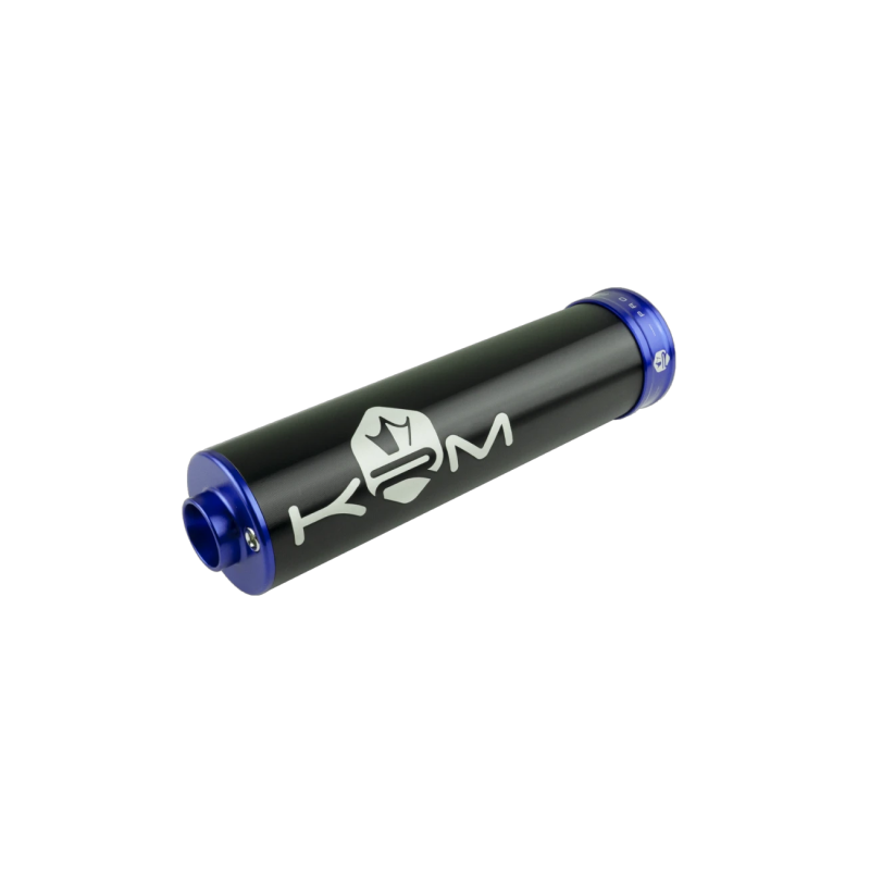 Universal KRM aluminium silencer for 50‑70 cc setups. Solid aluminium construction, 2‑ or 3‑bolt mounting. Available in Black, Black/Red and Black/Blue.