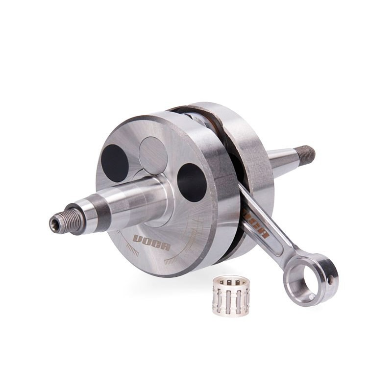 New high-quality VOCA crankshafts for tuned engines. Produced exclusively with high-quality materials, complete with black anodized aluminum inserts that lower the weight of the crankshaft and increase the performance of the engine. VOCA crankshafts are made to resist and to improve the performance of the most powerful cylinders. Equipped with CNC-manufactured connecting rod and a silver needle bearing. Standard dimensions, tested up to 16,000 RPM. Available for Derbi Euro2, Derbi Euro 3 and Minarelli AM6 engines.