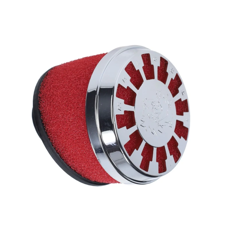 Malossi E13 air filter with 32–38mm angled (25°) connection. Suitable for Dell’Orto PHVA, PHBG, PHBL, and PHBN carburetors. Red foam filter with chrome end cap.