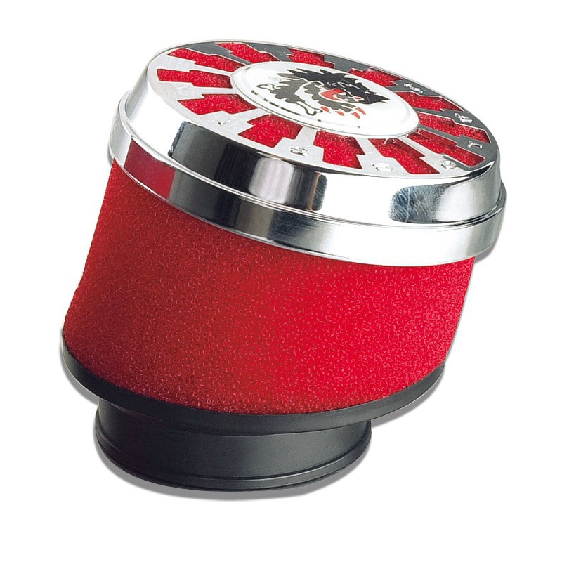The Malossi Red Filter E13 is a high-performance angled air filter (25°) with a 58.5mm connection, designed for threaded Dellorto PHBG (15–21mm) and PHBL (20–26mm) carburetors. The kit includes adapters (B10323 and B09814) for proper installation.