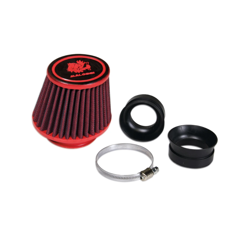 The Malossi E18 Red Filter is a high-quality straight air filter with a 42/50/60 mm connection. Supplied with 42mm and 50mm adapters, this model is compatible with Dell’Orto PHBH, Mikuni, and Keihin carburetors.