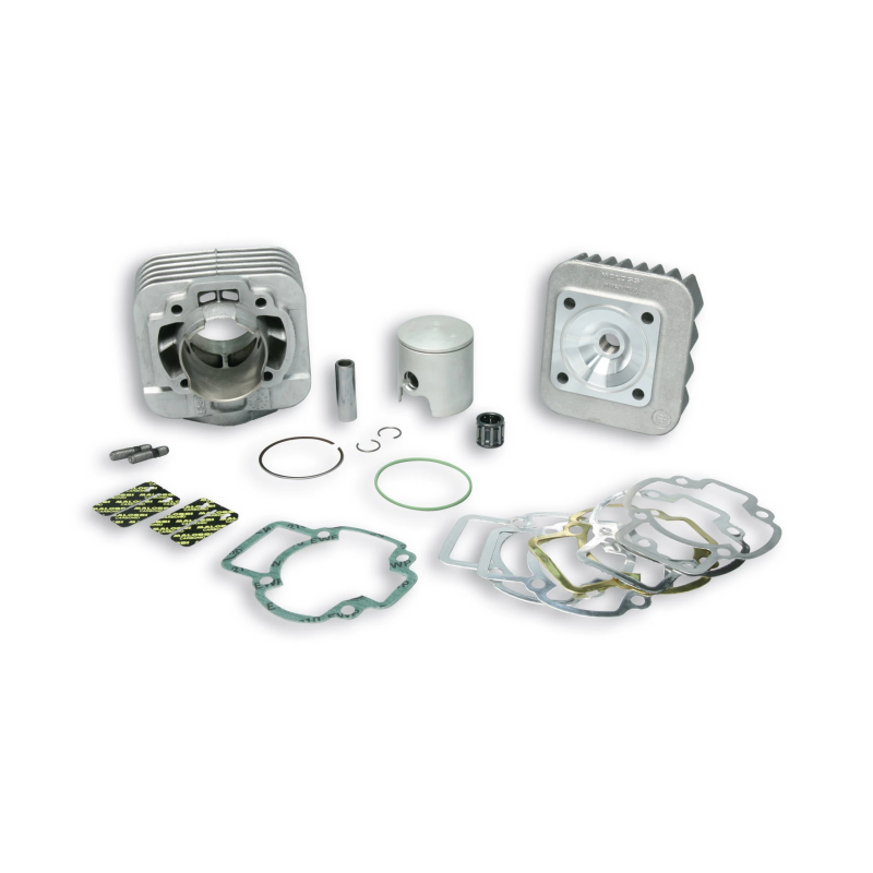 Malossi MHR 70cc cylinder kit (47.6mm) for new type Piaggio and Gilera air-cooled 2-stroke engines. Aluminium race cylinder with butterfly exhaust port and 6 transfer ports. Includes cylinder head, piston, reed petals and gasket set.