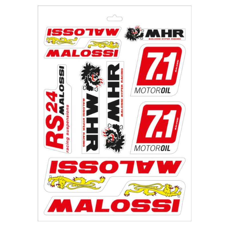 Complete 10-piece original Malossi sticker set for scooters. Ideal for tuning and personalization. Sheet size: 24.7x35 cm.