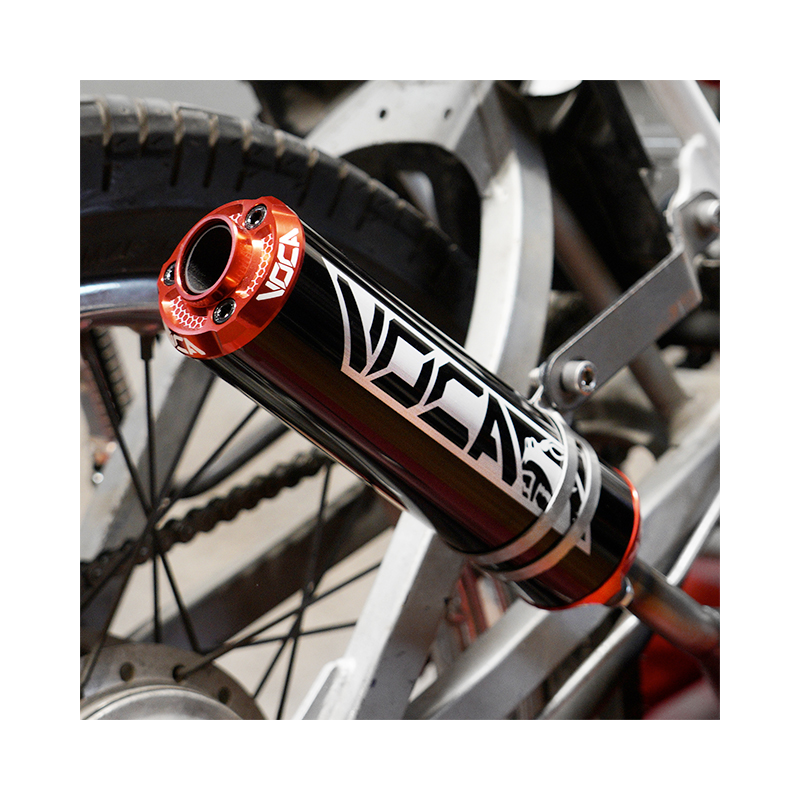 The VOCA Alu-Black muffler is compatible with almost all popular exhaust systems, such as Metrakit SP, Metrakit ProRace, SCR Chrome, SCR Handmade, SCR Racing Line, Barikit BRK, and the VOCA series itself, including BigBore 90, Carbon 80cc, Rookie 50/70 (CE), Warrior 50/70, Chromed 50/70 (CE), Blaze, MJC and KRM. This makes it a versatile choice for riders looking for a reliable and stylish upgrade.