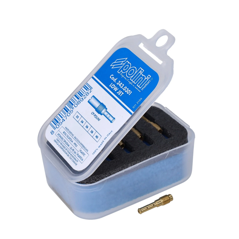 Idle jet set for Polini CP carburetors. Includes sizes 32, 34, 36, 38 and 40, perfect for fine-tuning the idle mixture.