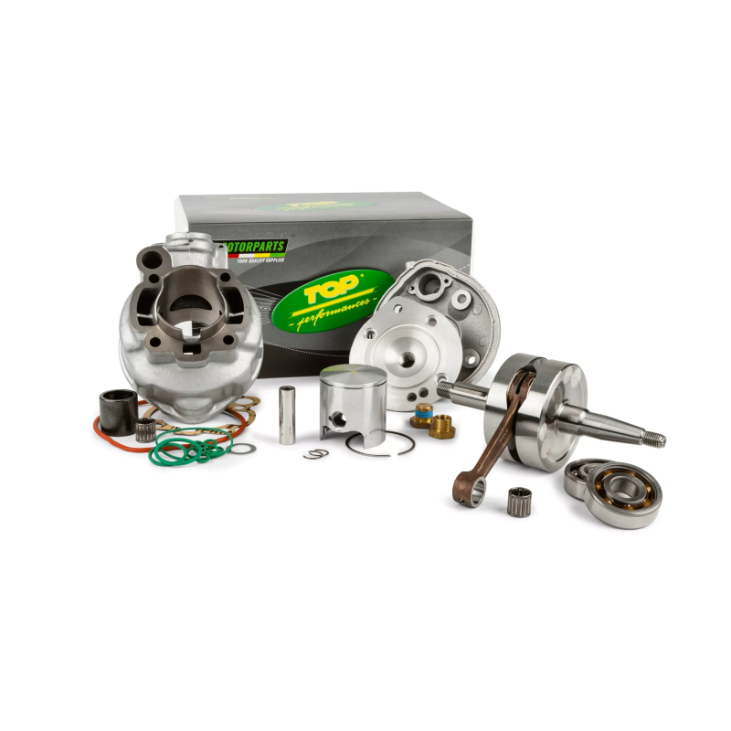 The Top Performances 85cc Big Bore kit is a complete high-performance setup for Minarelli AM6 (AM5/AM6) manual engines. This kit combines a 49.5mm cast iron cylinder with a 44mm stroke crankshaft, resulting in approximately 85cc displacement.