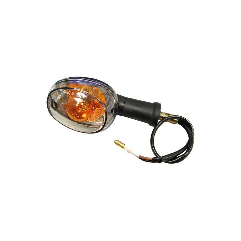 This universal turn signal features a dark lens and is suitable for mounting on the left front or right rear of various mopeds and scooters, including Tomos and CPI models.