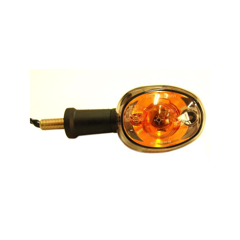 This universal turn signal features a dark lens and is suitable for mounting on the right front or left rear of various mopeds and scooters, including Tomos and CPI models.