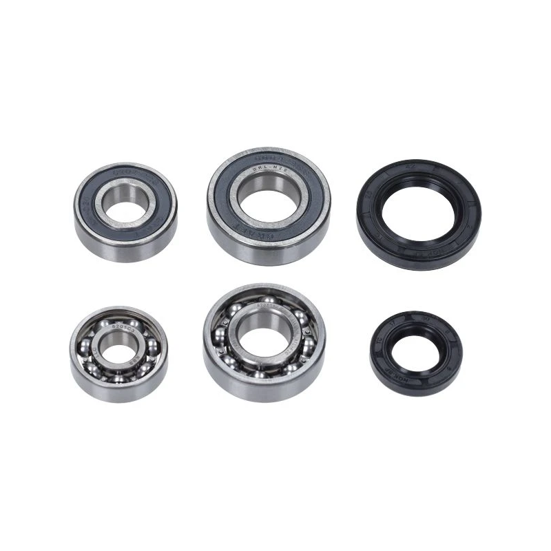 6‑piece transmission (vertanding) bearing kit for Peugeot 2‑stroke scooters with horizontal cylinder. Includes 4 ball bearings and 2 oil seals – fits Ludix, Speedfight 3, New VivaCity.