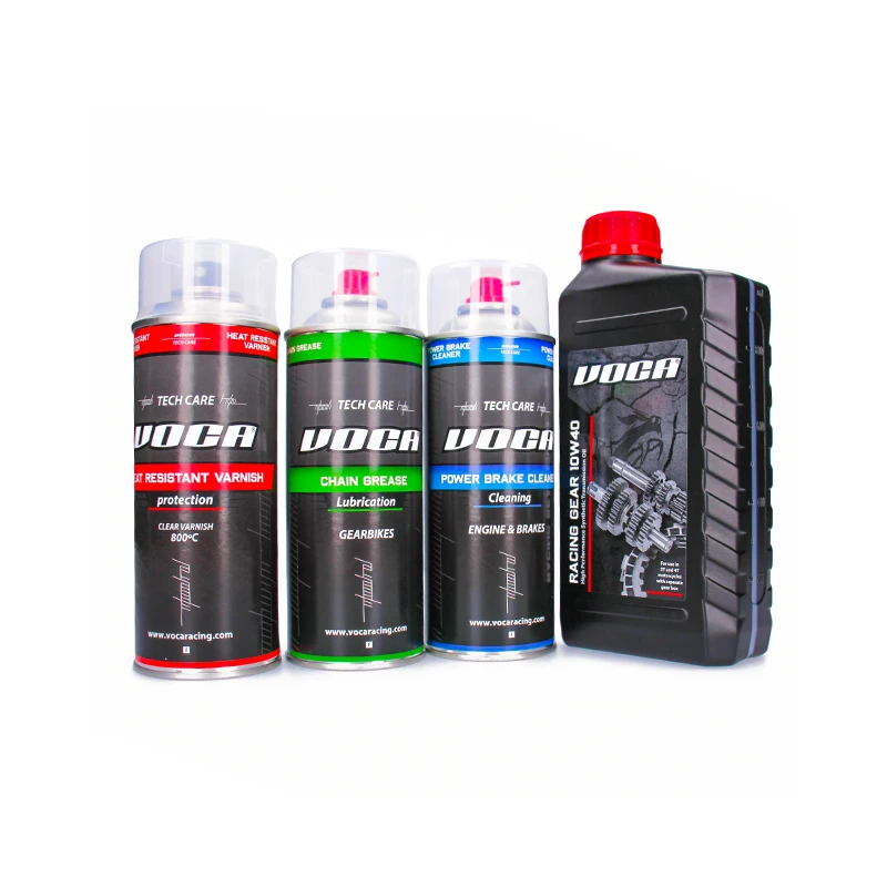Complete Voca Tech-Care maintenance kit for gearbikes. Includes 4 essential products: chain grease, brake cleaner, 800°C varnish, and 10W40 synthetic gear oil. Now available as a value pack!