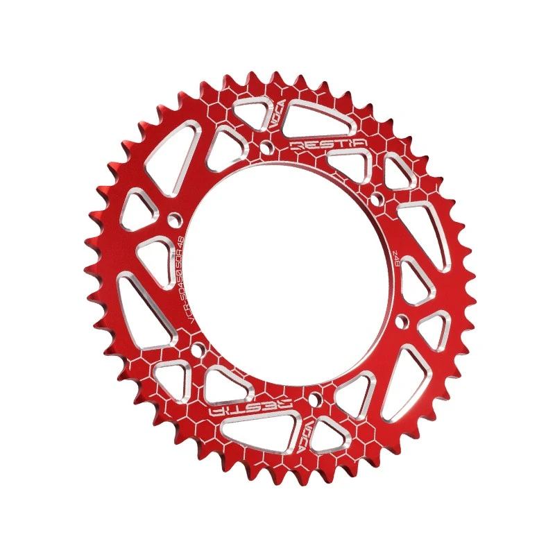 VOCA CNC 48T rear sprocket for 420 chain. Designed for Derbi DRD, RS4, and GPR Nude models with cast wheels. Available in black, red, blue and titanium.