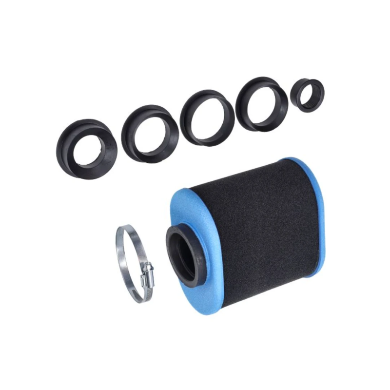 Universeel Polini Big Evolution luchtfilter met ovale vorm en aansluiting van 28 t/m 55mm. Inclusief 5 adapters voor diverse carburateurs.