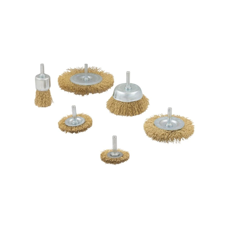 6-delige staalborstelset met stift, geschikt voor montage in de boormachine. Ideaal voor reinigen, ontroesten en verwijderen van vuil en verf op diverse oppervlakken.